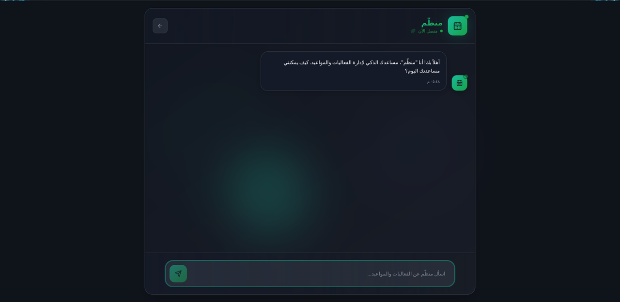 Munazzem (Arabic for "Organizer") is a sophisticated, full-stack AI chat application. Its primary function is to serve as a specialized assistant that answers user queries about a predefined list of events. The project demonstrates a secure and scalable architecture by separating the client-facing application (Frontend) from the service that communicates with the AI model (Backend).