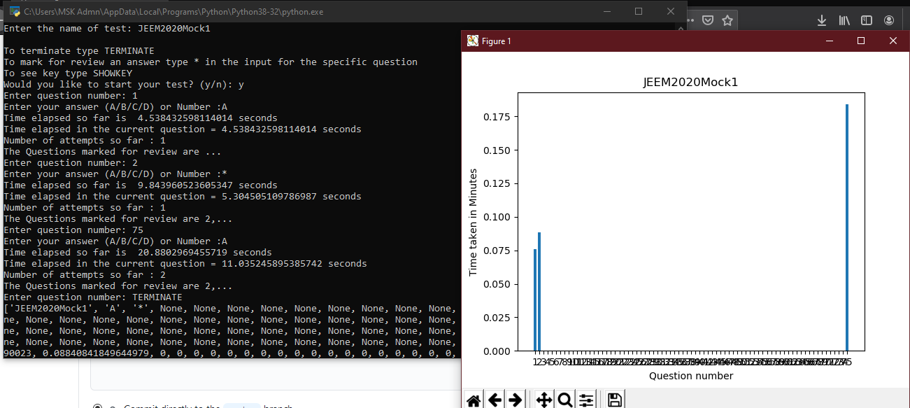 Once the Answer key program has been run, the user is supposed to start with a test for JEE mains (75 questions only). Further prompts from the program can be followed accordingly. The program permits maximum of 10800 seconds, i.e. 3 hours for completion of test. Upon completion, the user is now given a graphical analysis of the time taken per question and after closing that the program prompts to analyze the test by adding comments and weak/strong and things to work on.