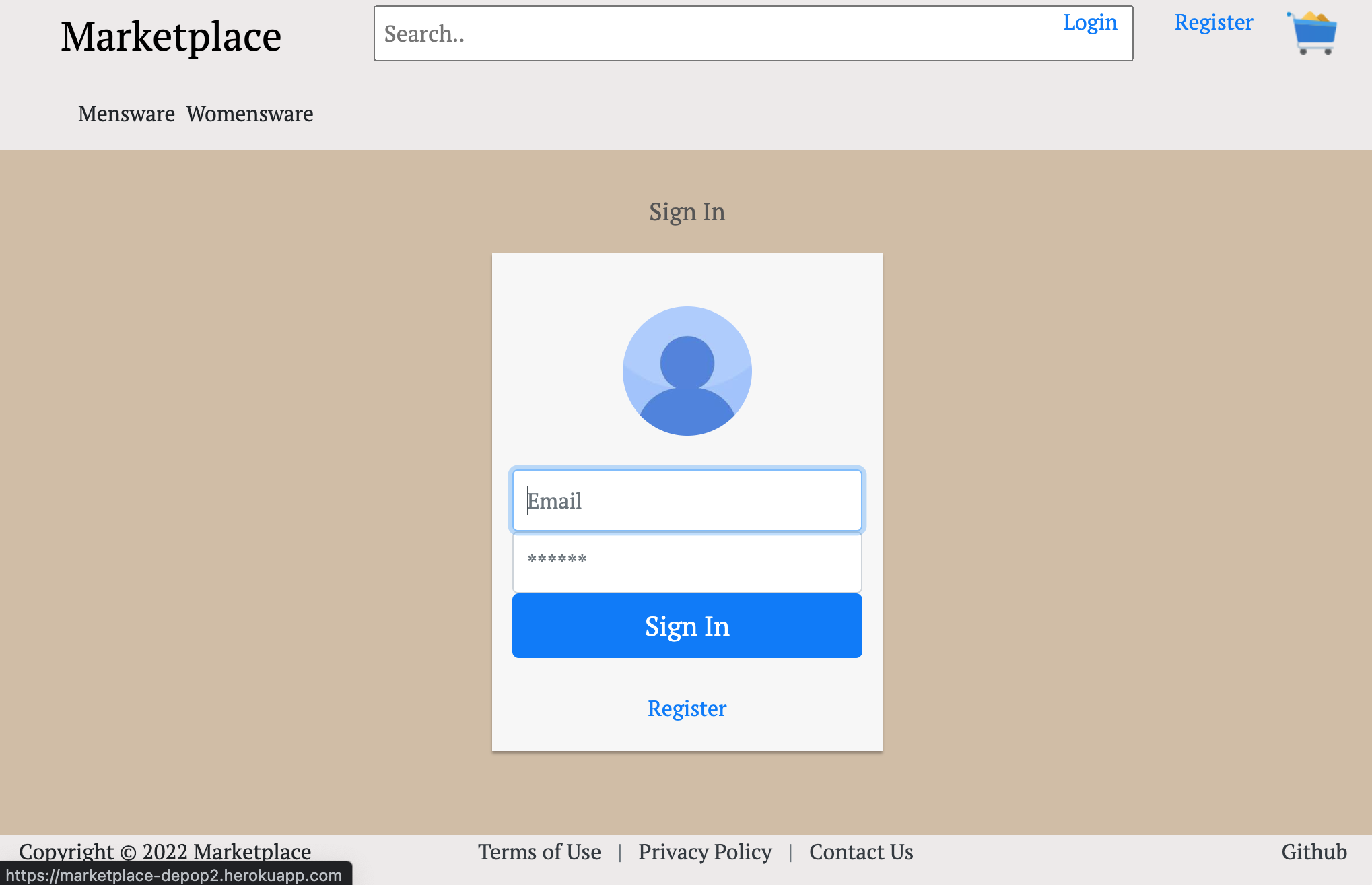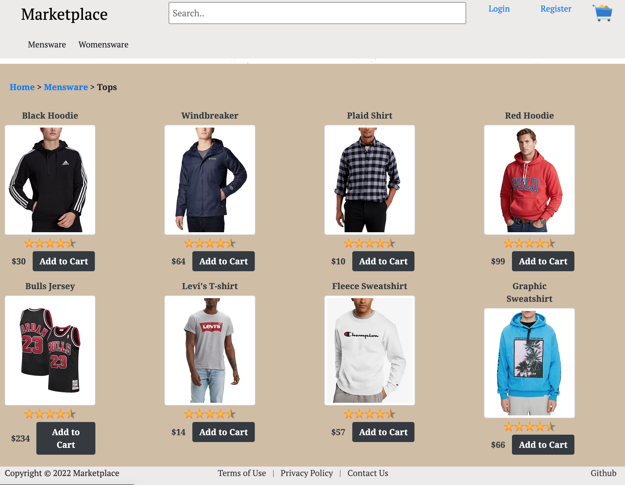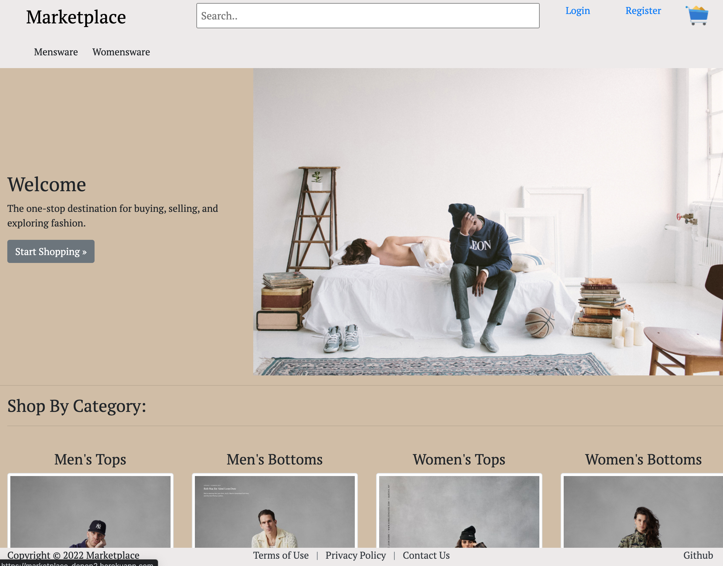 A clothing marketplace that features industry standard shopping features. A user comes to the site and decides what they want to purchase after thorough browsing of select jewelry, men's clothing, and women's clothing. The site includes interactive features that make it intuitive for the user to come in and purchase what they want, when they want with only a few clicks.