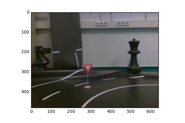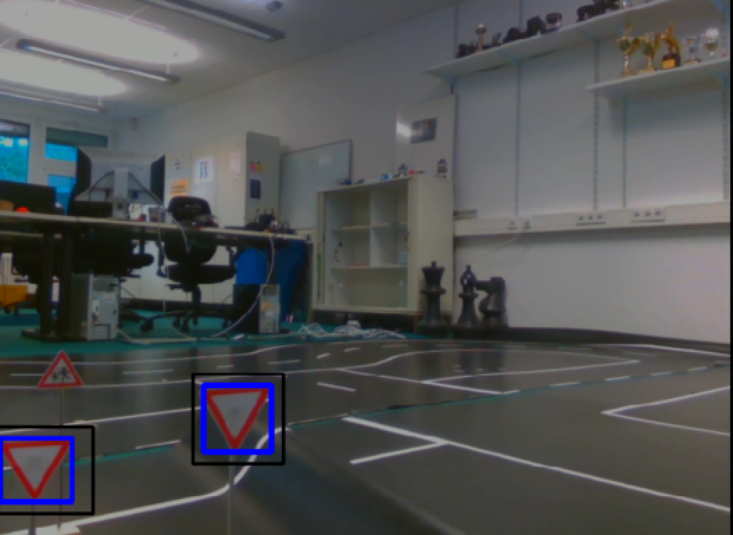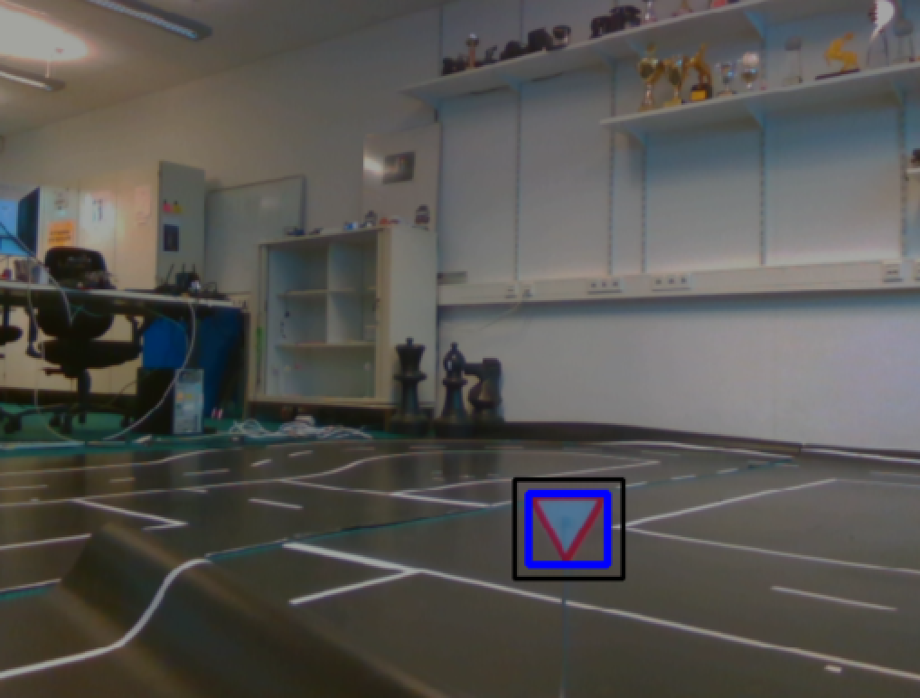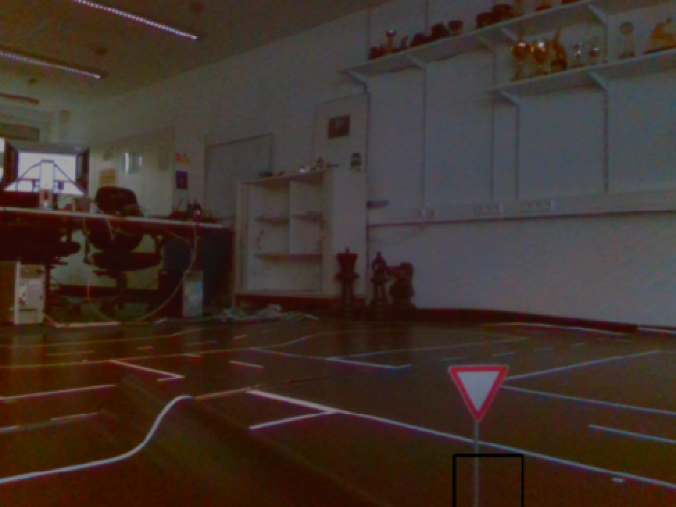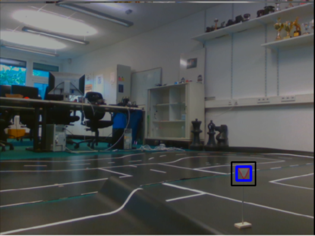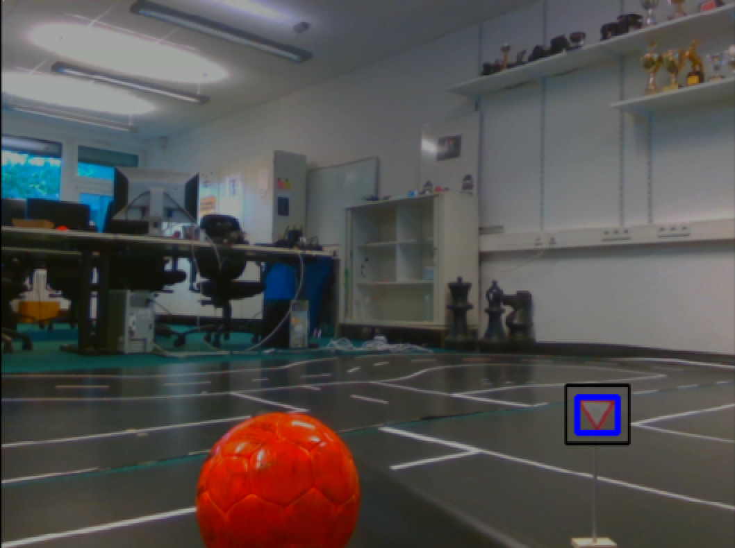 We want to take the camera image from ROS and then find traffic signs. It's also important that we're able to show where in the image the traffic sign was found. For visualization purposes, we draw a bounding box for this.