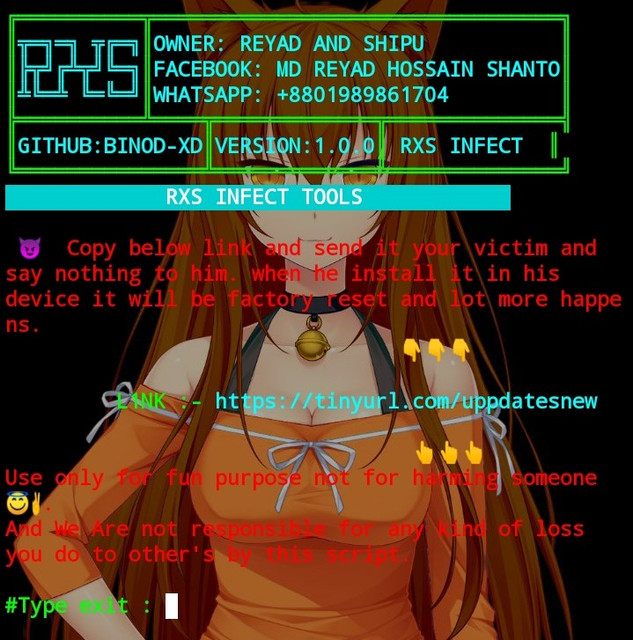 Infect is a bash based script which is officially made for termux users and from this tool you can spread android virus by just sending link. This tool works on both rooted Android device and Non-rooted Android device. Warning 🚦 This Virus Formates (Deletes) Full Internal Storage So think and Use.