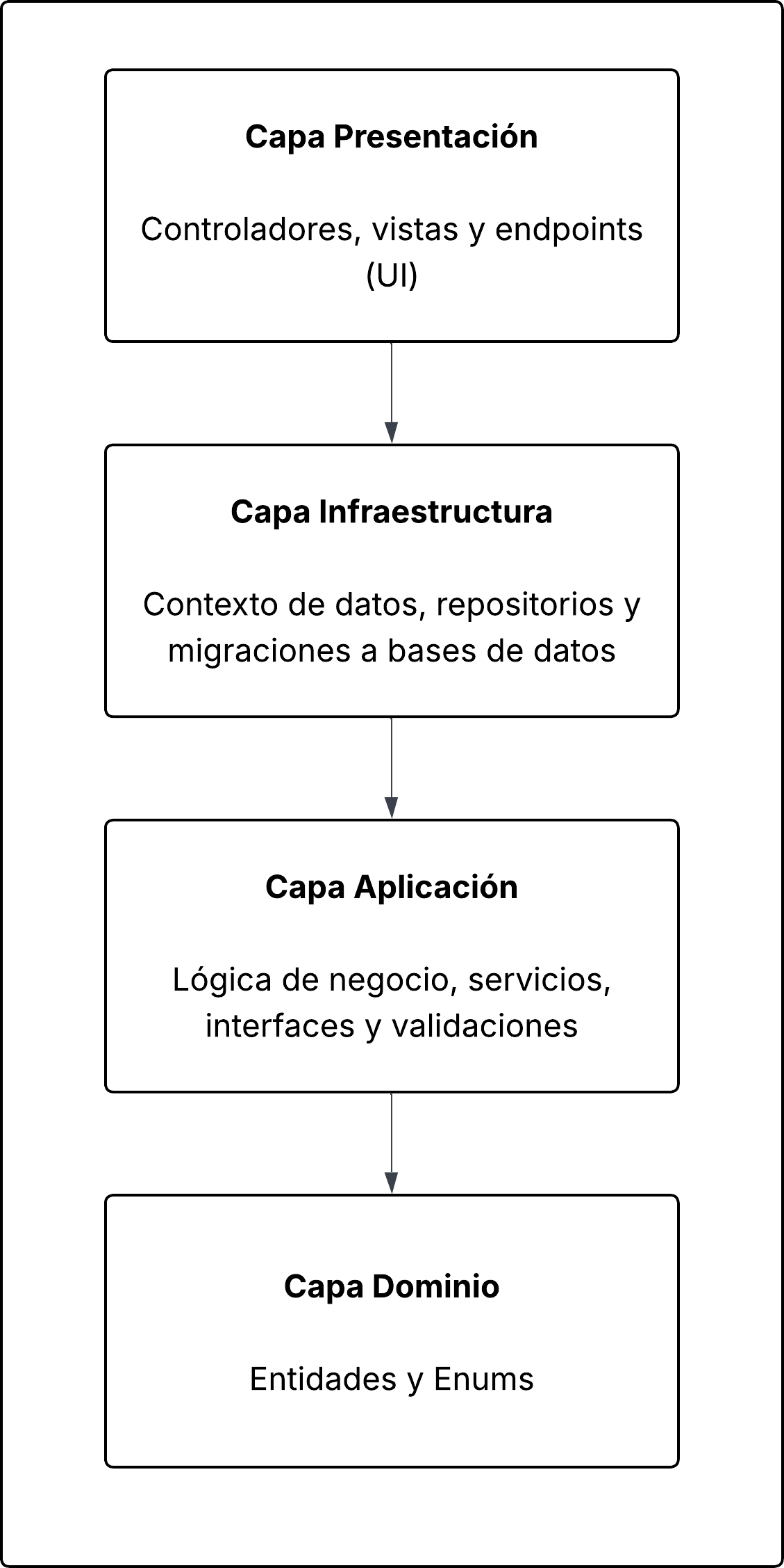El sistema sigue una arquitectura en capas, que facilita la separación de responsabilidades, el mantenimiento y la escalabilidad.