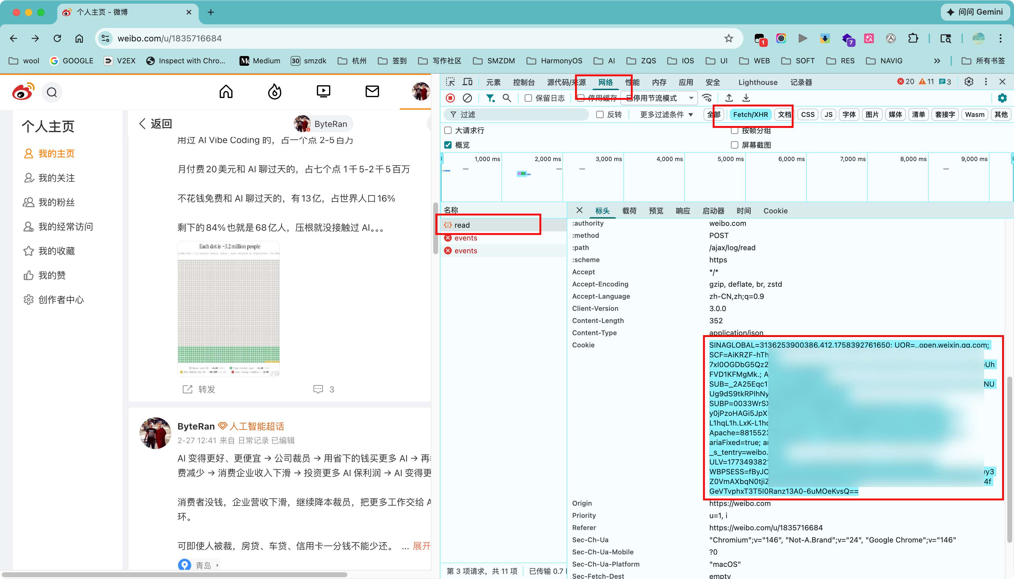 read请求) - 在右侧 Headers(标头) 中找到 Cookie 字段