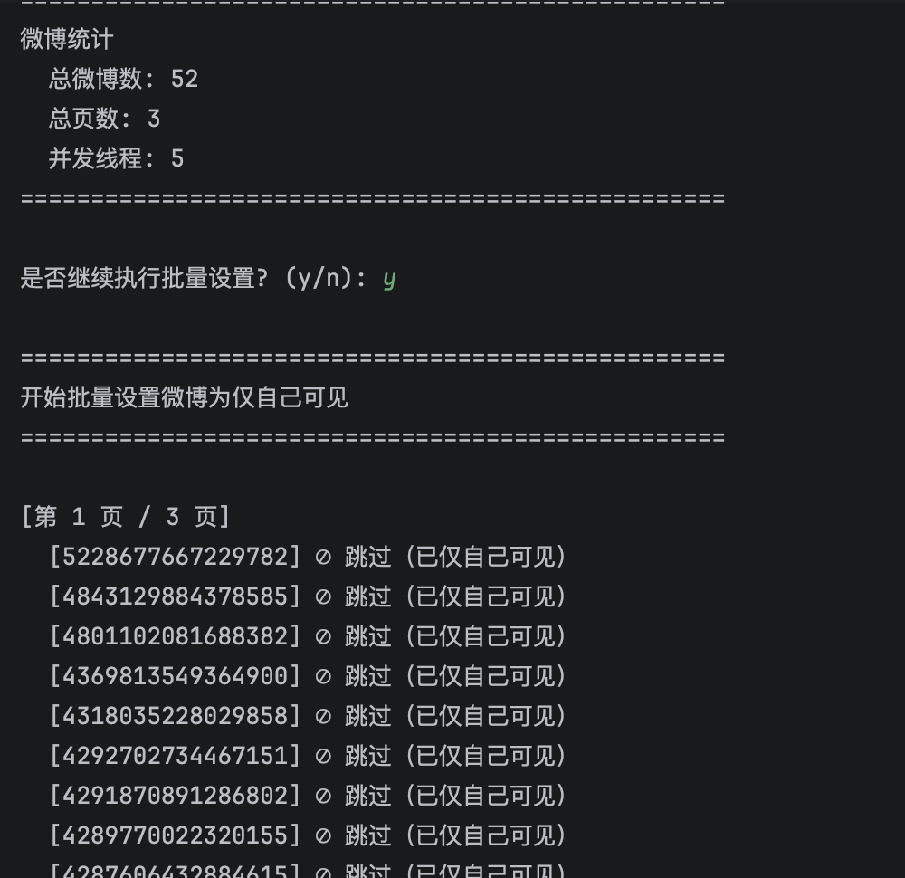 - 自动跳过已隐藏 - 自动跳过已经是仅自己可见的微博