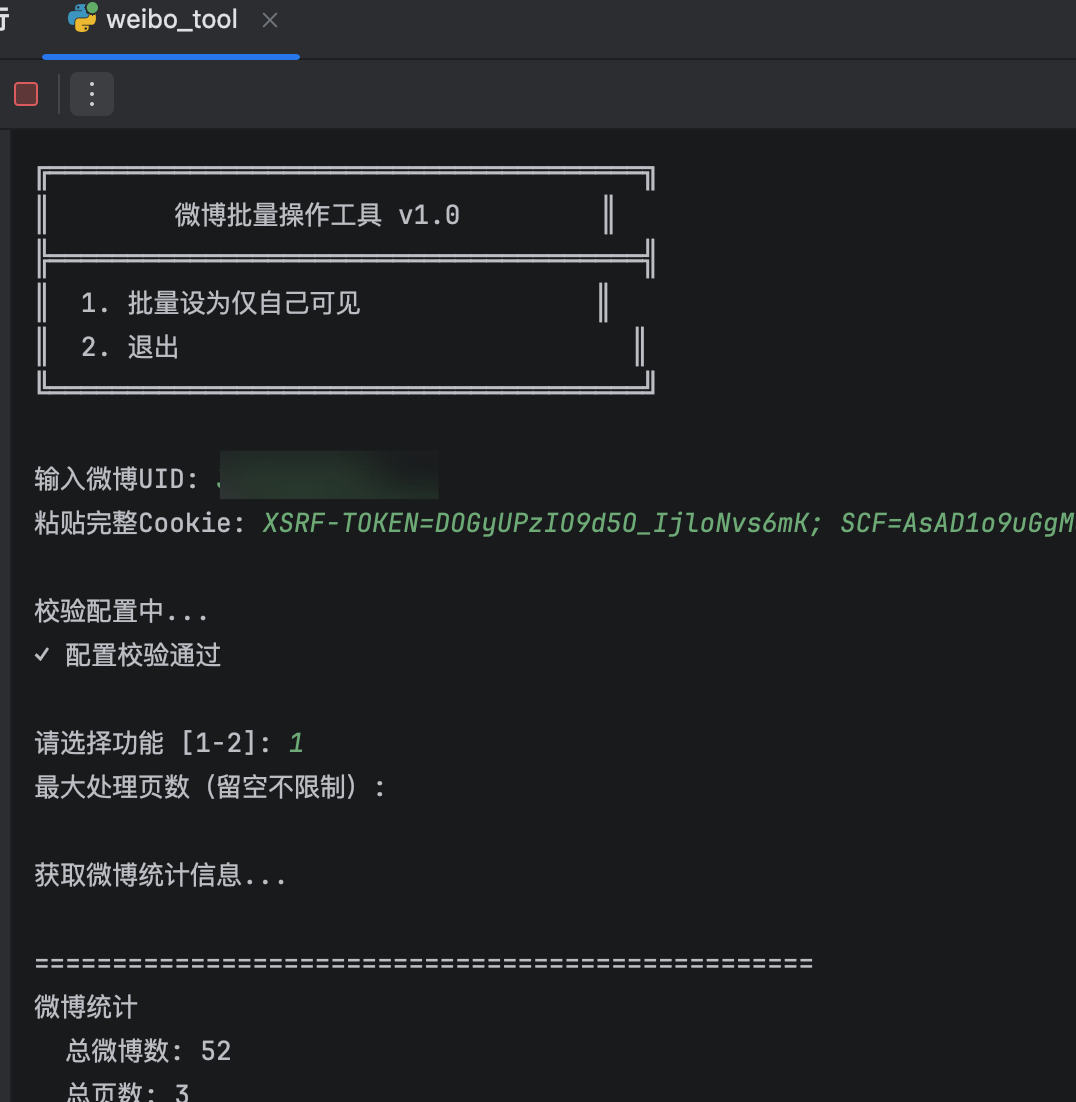 python weibo_tool.py运行后依次输入获取到的 UID 和 Cookie 即可。
