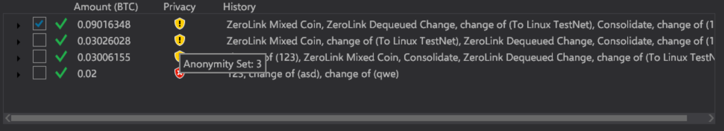 Coins in Wasabi have Privacy and History properties. The anonymity set is just a momentary estimation, however, by examining the mixes and other people's transactions we will be able to show accurate values. The History is the calculated clusters from the labels based on typical Blockchain analysis heuristics. For example, if the user joins together a "foo" labeled coin with a "bar" labeled coin at sending, then the change coin history will show "change of (foo), change of (bar)". From this, users are able to make educated decisions as to which coins not to join together at any cost. Human input is invaluable.