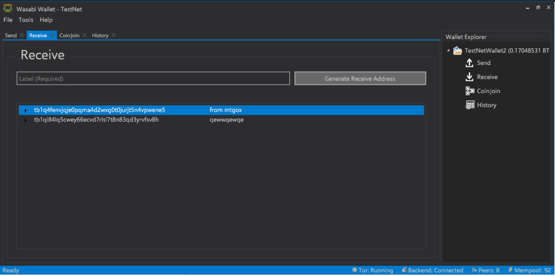Back to Wasabi. After loading the wallet, the user can generate a receive address. Some important design choices were made here. First, Wasabi had to be a Segregated Witness only wallet, so the registration of unconfirmed coinjoin outputs into a new coinjoin round is done to prevent malleability attacks. However, the developers of Wasabi decided to make the wallet native segwit (bech32) only, not supporting wrapped segwit. This way, the backend server can leverage this and only generate filters regarding bech32 addresses. This makes Wasabi's filter size a few megabytes today, instead of >4GB. At first glance, this may be seen as hazardous to privacy, however Wasabi user utxos can be identified as Wasabi utxos by the huge coinjoins that only Wasabi does anyway, so minimal to no additional privacy loss happens there. In the future, as more and more wallets adopt bech32, Wasabi developers will have to look at how to scale the performance and network usage of the wallet. Failing that, Wasabi's initial sync will slow down.