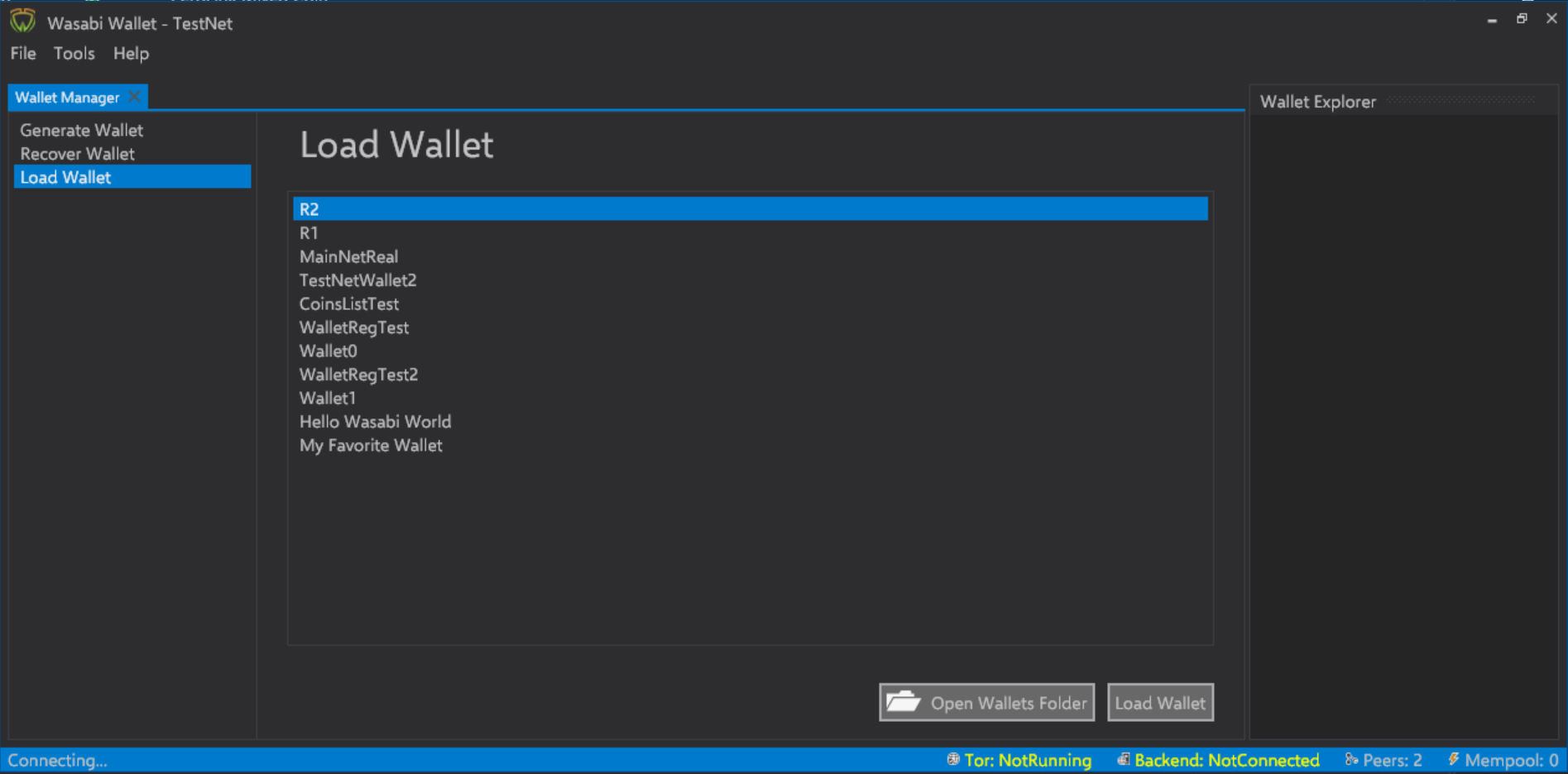 After setting up Wasabi and generating a wallet, Wasabi welcomes the user with a load wallet screen. Unlike other wallets, Wasabi has a convenient way to use multiple wallets. Privacy centric users may be already used to achieve coin separation this way. However Wasabi provides a convenient in-wallet coin separation interface too, more information will be provided about that later on. Since coin separation can be easily achieved without multiple wallet files, initially the developers did not plan for such a wallet management system, our UX design choices naturally lead us down this road.