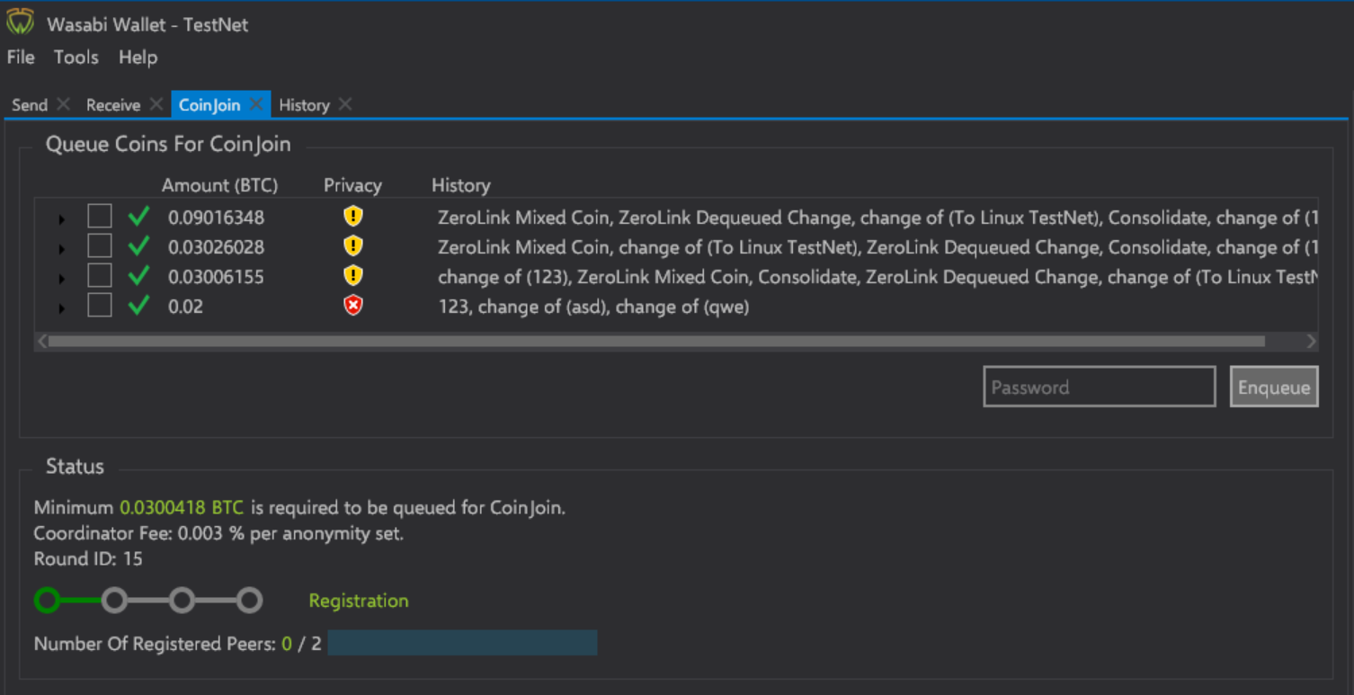 Wasabi has a CoinJoin tab as well, its use is straightforward. The user queues their coins for coinjoin and waits for others to join the mix.