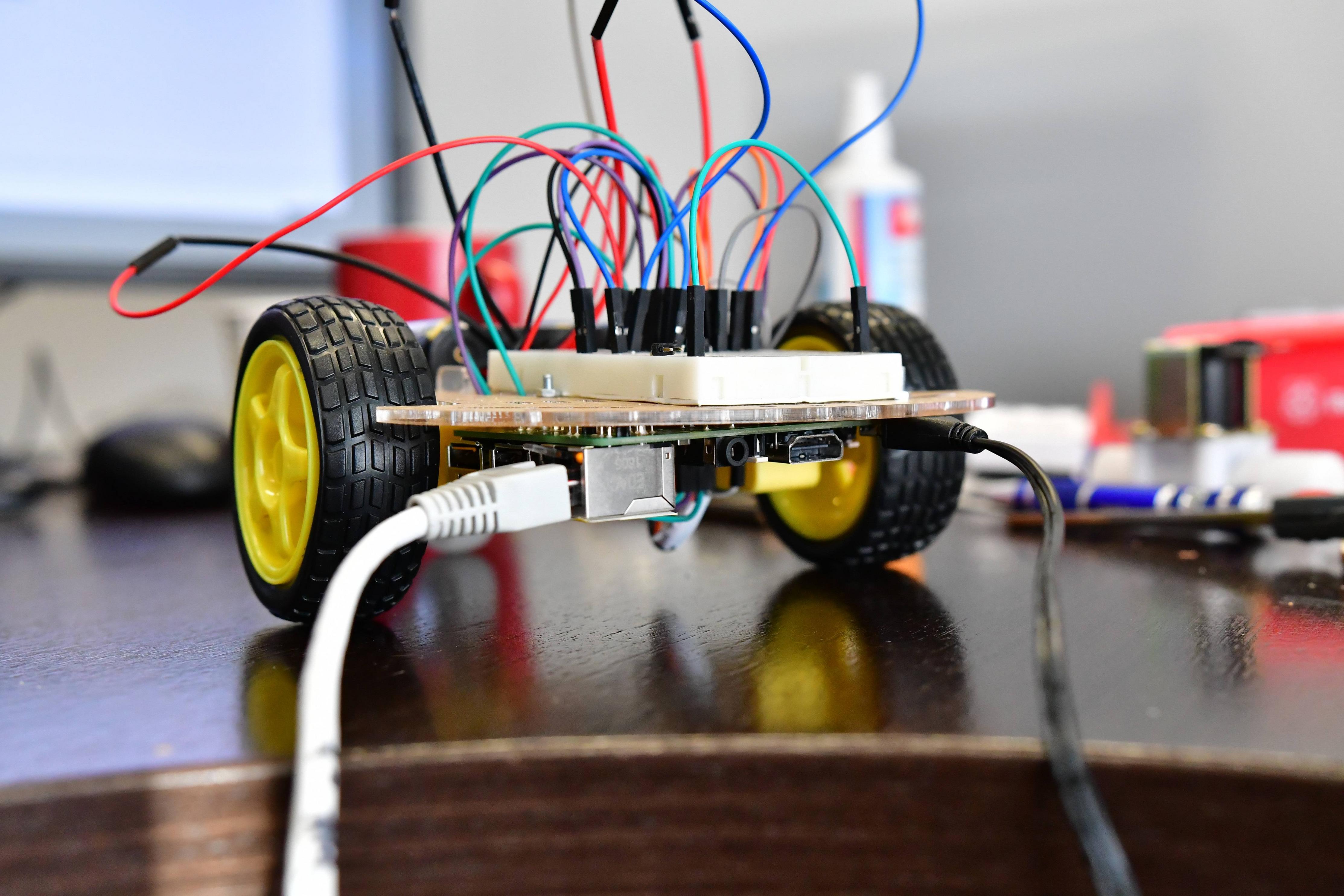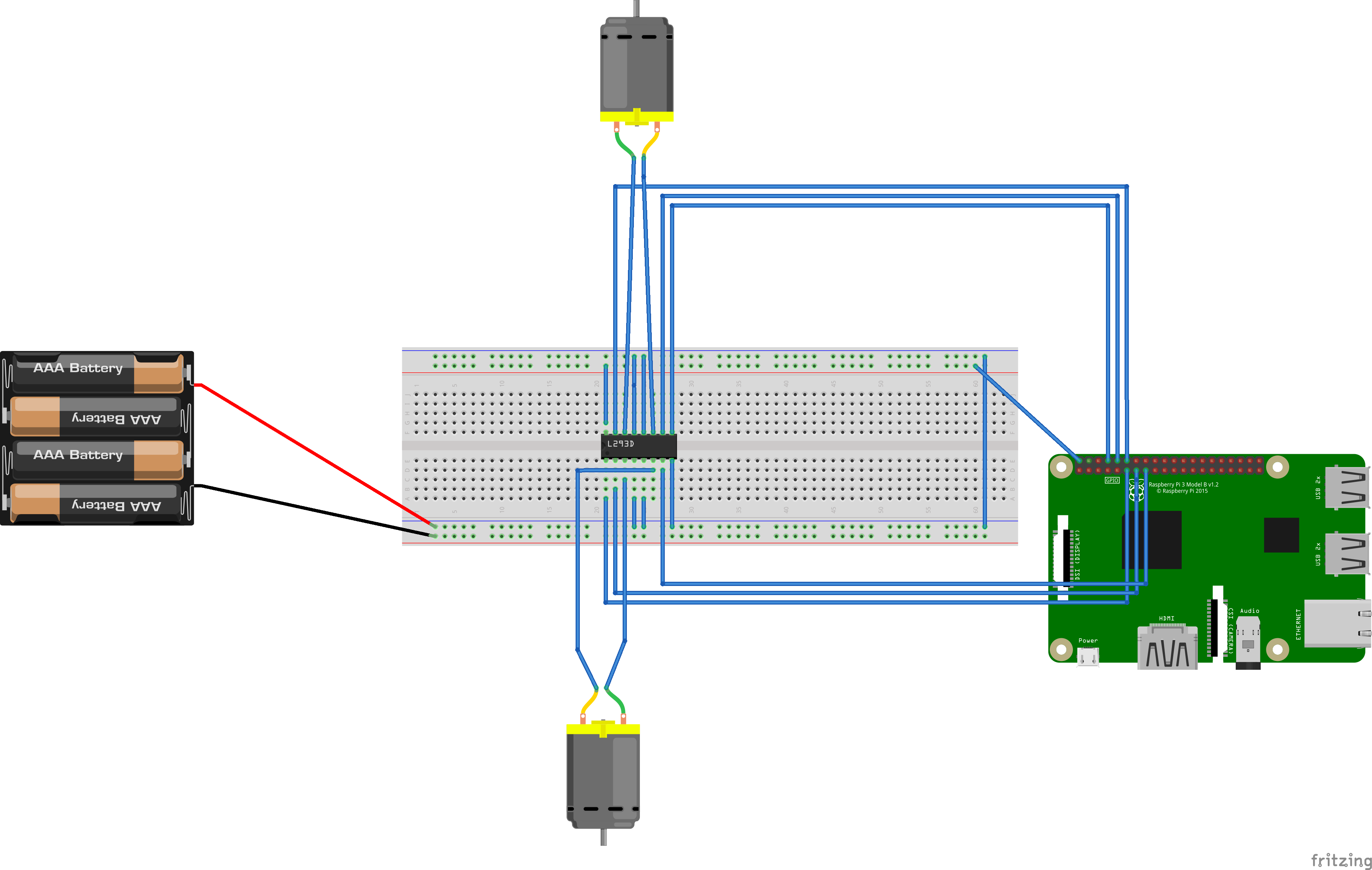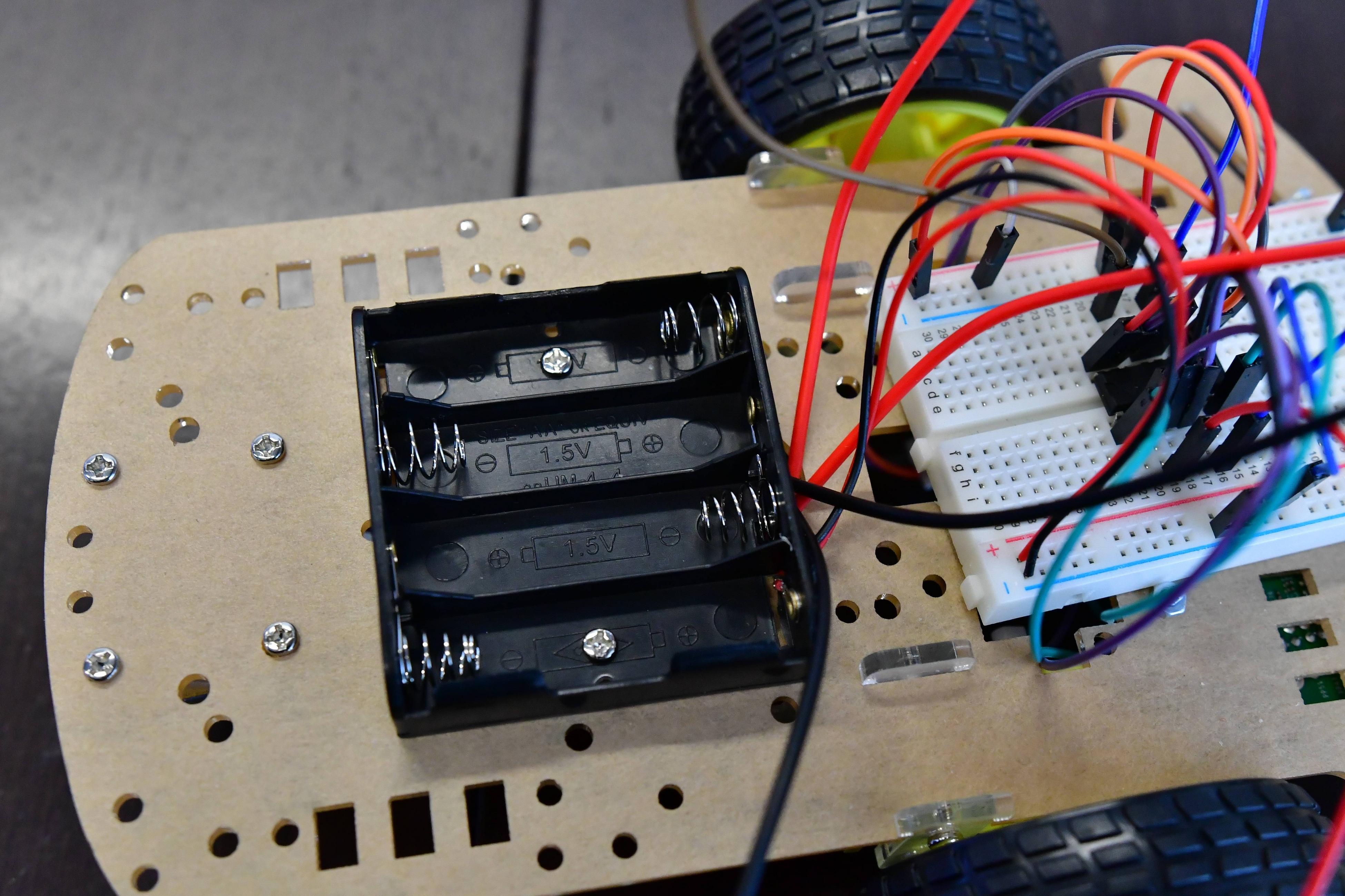 Place the raspberry pi under the chassis and breadboard on the top. Place the battery holder on the chassis and screw it in.