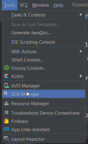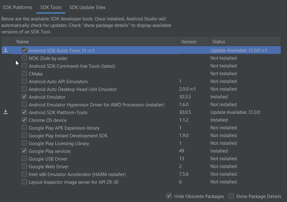 Navigate To SDK Tools and check Android Emulator, Chrome OS Device, Google Play Services, Android SDK Build Tools and Android SDK Platform Tools