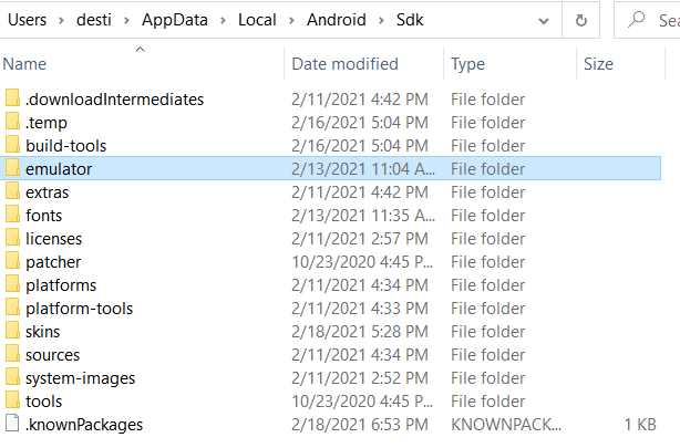 Open the android SDK folder based on the path that's provided in the SDK manager. Replace "emulator" with the emulator folder you downloaded above.