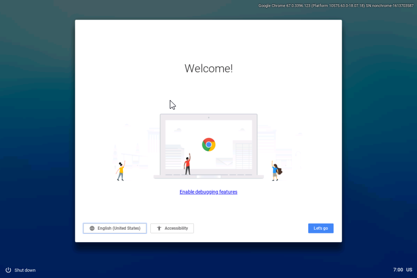 Select blue "Lets go", then "next" for network access, then accept the chrome os terms. After, sign in with your google account. Select Accept and continue. Finally, when google play apps and services appears, select the blue "More" button, then the blue "I Agree" button. Skip the google assistant setup. You should see your ChromeOS desktop.