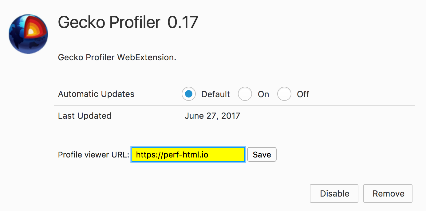 about:addonsin your URL bar. - Click Preferences button next to the Gecko Profiler addon.