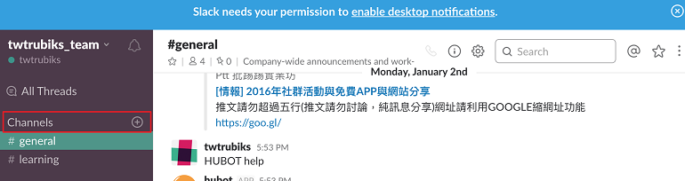 接著到你自己的 Slack ( 申請步驟這邊不介紹了 ),點選左邊 Channels 的 +