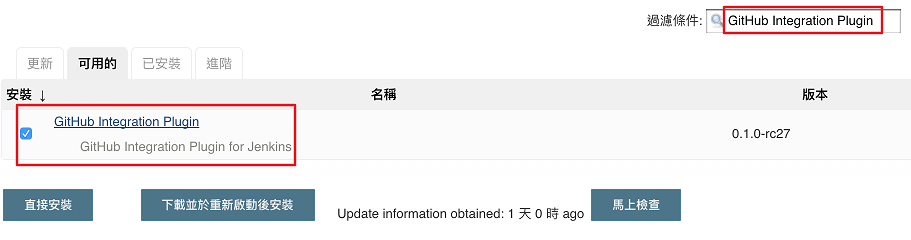 接著搜尋 GitHub Integration Plugin,如果你已經安裝則會出現在已安裝那邊