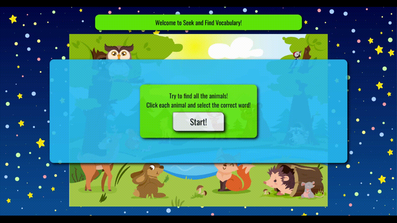 Seek-and-Find vocabulary is a language learning application, designed to help with vocabulary retention through the gameification of basic vocabulary word groups (i.e. animals, furniture, jobs, prepositions, etc).
