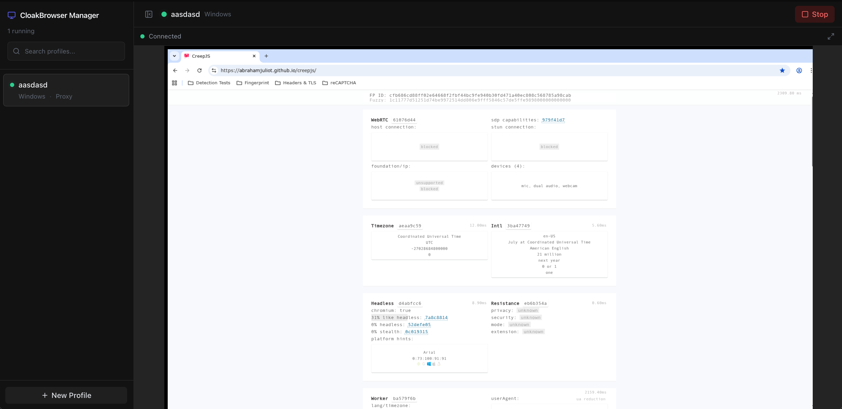- Per-profile settings — fingerprint seed, proxy, timezone, locale, user agent, screen size, platform