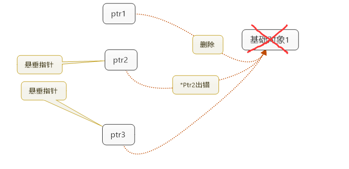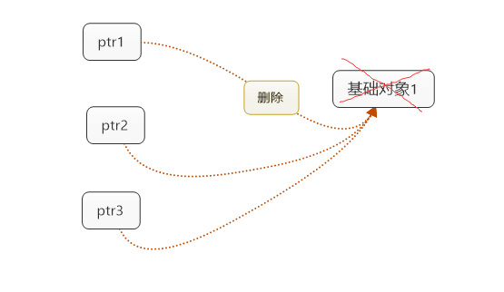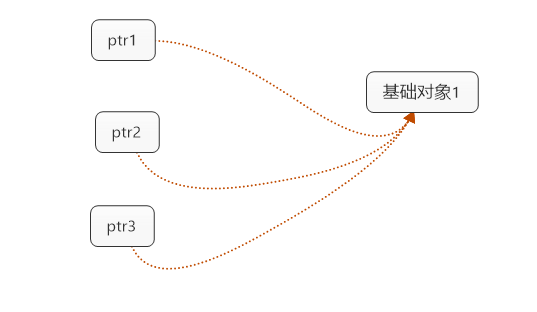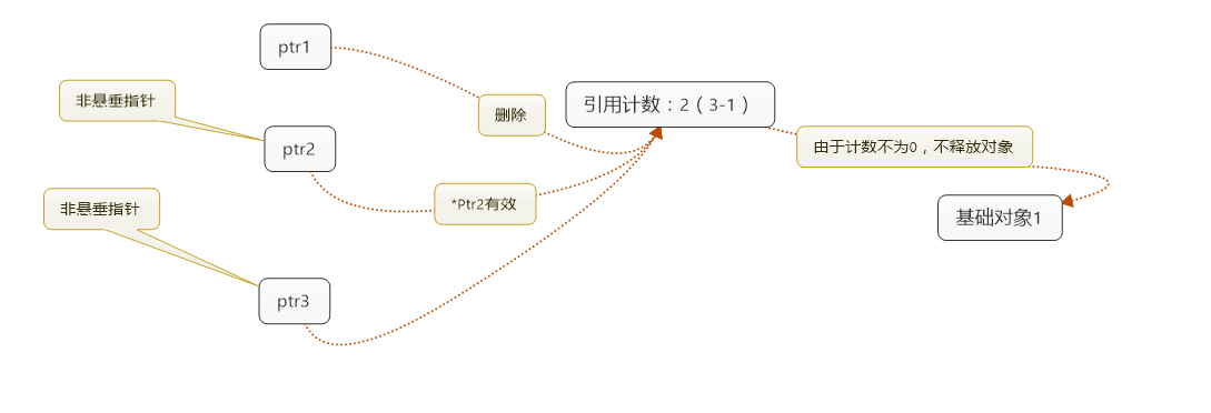 从图可以看出,错误的产生来自于ptr1的"无知":它并不知道还有其他指针共享着它指向的对象。如果有个办法让ptr1知道,除了它自己外还有两个指针指向基础对象,而它不应该删除基础对象,那么悬垂指针的问题就得以解决了。如下图: