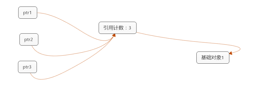 那么何时才可以删除基础对象呢?当然是只有一个指针指向基础对象的时候,这时通过该指针就可以把基础对象删除了。如何让指针知道还有其他指针的存在呢,加入引用计数即可。