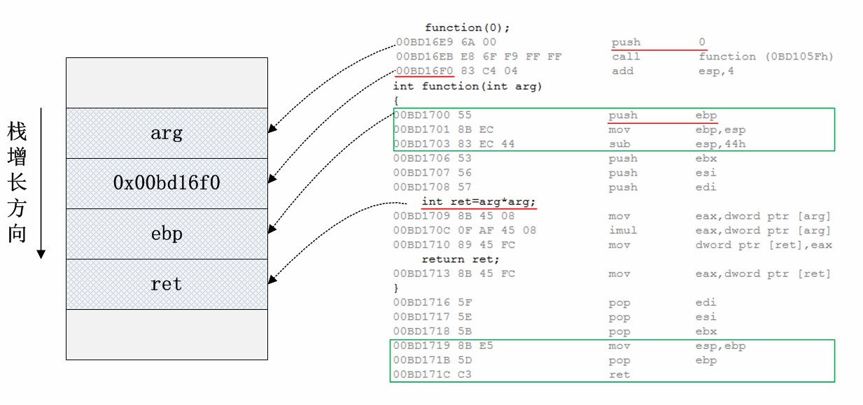 如图所示,定义了一个简单的函数function,它接受一个整形参数,做一次乘法操作并返回。当调用function(0)时,arg参数记录了值0入栈,并将call function指令下一条指令的地址0x00bd16f0保存到栈内,然后跳转到function函数内部执行。每个函数定义都会有函数头和函数尾代码,如图绿框表示。因为函数内需要用ebp寄存器保存函数栈帧基址,因此先保存ebp原来的值到栈内,然后将栈指针esp内容保存到ebp。函数返回前需要做相反的操作——将esp指针恢复,并弹出ebp。
