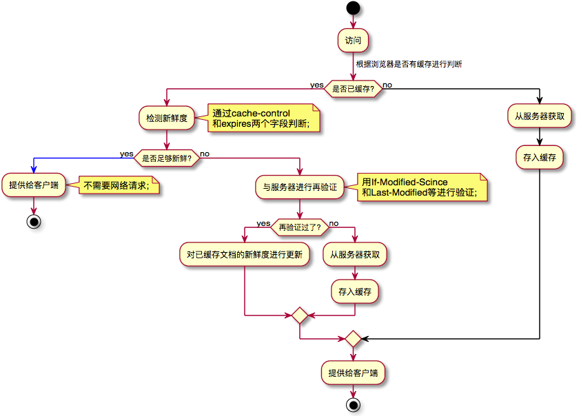 缓存已过期(红色线):当满足过期的条件时,会向服务器发送请求,发送的请求一般都会进行一个验证,目的是虽然缓存文档过期了,但是文档内容不一定会有什么改变,所以服务器返回的也许是一个新的文档,这时候的HTTP状态码是200,或者返回的只是一个最新的时间戳和304状态码。