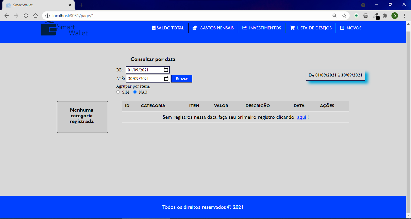 Index da aplicação: Aqui aparecerá todos seus registros e resumo de valores das categorias. E também pode filtrar os registros por data. (Ao entrar, por padrão ele puxa a data do mês atual)