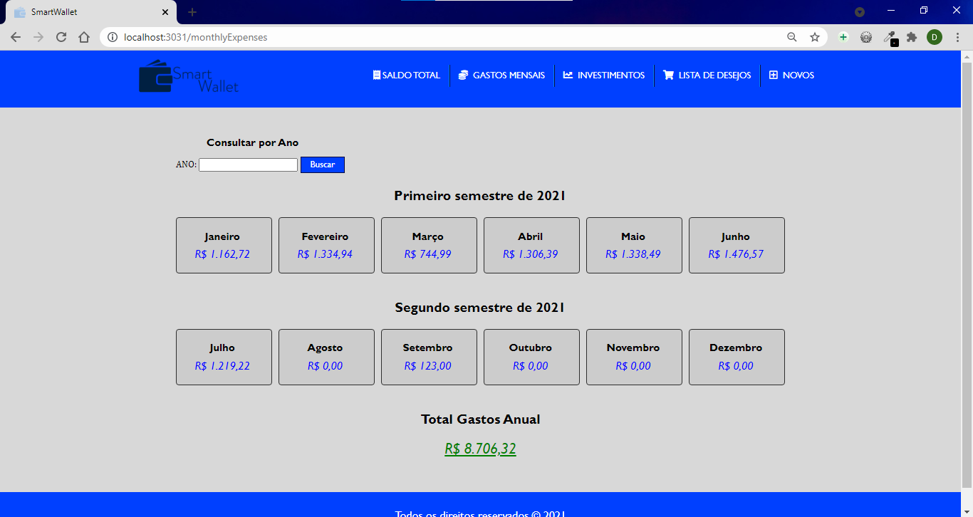 Página de gastos mensais: Aqui consegue ver o total de gastos por mês e o total gasto no ano. (É possível filtrar por ano) Dados fictícios.