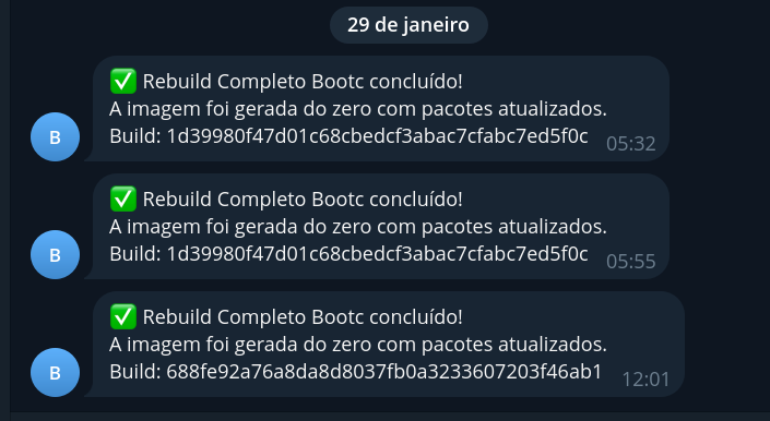 Além disso, configurei no GitHub Actions a integração com o bot do Telegram @Botfather, que me notifica automaticamente pelo Telegram sempre que o build da imagem é concluído com sucesso ou apresenta alguma falha.