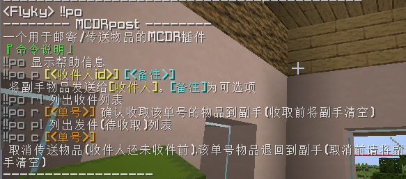 !!po显示帮助信息!!po p [收件人id] [备注]将副手物品发送给[收件人],[备注]为可选项!!po rl列出收件列表。包括[发件人],[寄件时间],[备注消息]和[单号]!!po r [单号]确认收取该单号的物品到副手(收取前将副手清空)!!po pl列出发件(待收取)列表,包括[收件人],[寄件时间],[备注消息]和[单号]!!po c [单号]取消传送物品(收件人还未收件前),该单号物品退回到副手(取消前将副手清空)!!po ls players查看可被寄送的注册玩家列表!!po ls orders查看当前中转站内所有订单 [helper以上权限可用]!!po player add [玩家id]手动注册玩家到可寄送玩家列表 [admin以上权限可用]!!po player remove [玩家id]删除某注册的玩家 [admin以上权限可用]
