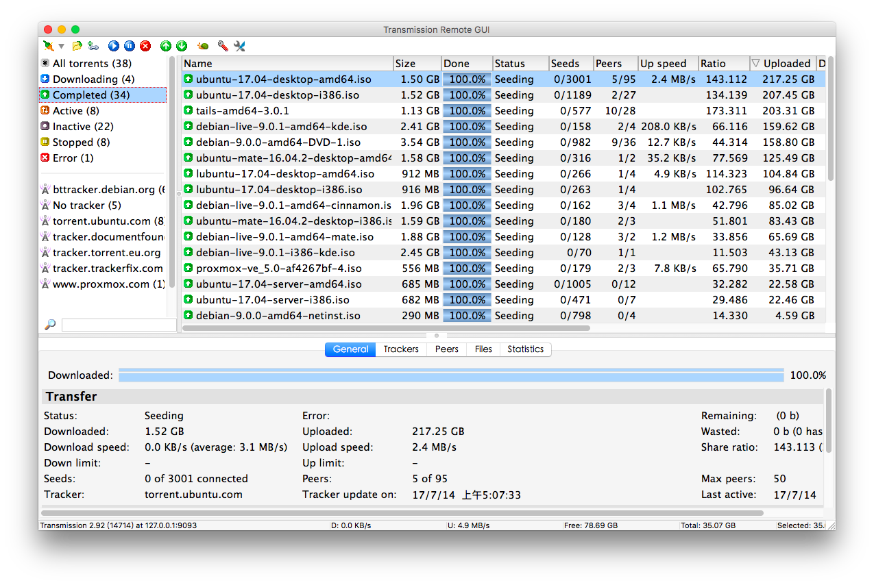 Transmission Remote GUI is feature rich cross platform front-end to remotely control Transmission daemon via its RPC protocol. It is faster and has more functionality than builtin Transmission web interface.