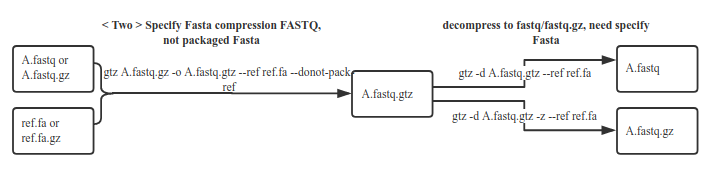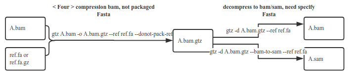 Using the-donot-pack-ref option, the resulting target gtz file is smaller, but the corresponding fasta needs to be specified when unzipping. We do not recommend using this option because without this option, the compression ratio has little effectcompared to this option, but if you use this option, you need to specify the appropriate fasta when unzipping and you have to ensure the fasta is properly saved in safe disk.
