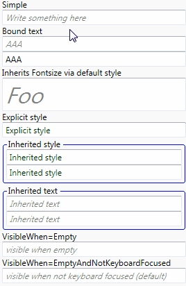 adorners:Watermark.VisibleWhen="EmptyAndNotKeyboardFocused" />The above examples render to the following visualisation: