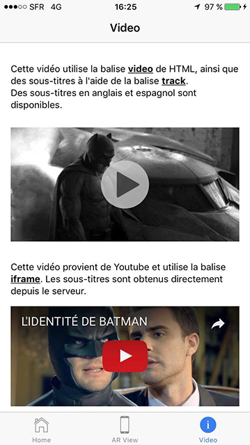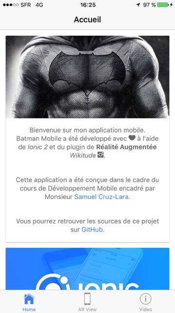 Batman Mobile est une application développée à l'aide de Ionic v2 et du plugin Wikitude. Ce projet a été réalisé durant le cours de développement d'applications web mobiles en Licence Professionnelle CISIIE.