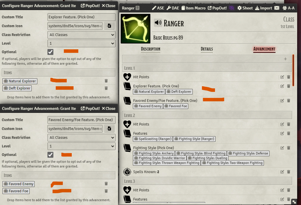 Due to Tasha's and other book rules some starting class features can be replaced by others. For example, Ranger has two "Explorer" Features to choose from and two "Favored" features. I have my advancement set to give these choices but the builder does not recognize these as choices and adds all options.