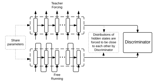 不同于Schedule Sampling采用预设的门槛来决定什么时候采用teacher forcing的训练方式和free running。professor forcing的方法采用训练一个分类器(discriminator)来对门槛进行评估。有点类似RL中的DQN和Policy gradients的关系,具体示意图如下: