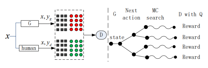 思路:如图所示,左边的部分是判别器(核心是CNN)的优化部分,利用真实资料和生成资料来训练判别器。右边的部分则是生成器(核心是LSTM)的优化部分,利用Monte Carlo的方式得到每一个时刻的reward,并借助policy gradient的强化学习方式进行模型优化更新。