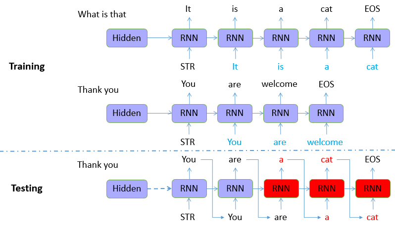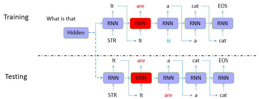 在training过程中,我们每一个时刻输入的都会是真实资料对应的值,因此即使出现错误,下一个时刻的输入仍然是正确的。但是在testing的过程中,由于缺乏真实资料的辅助,如果上一个时刻的结果出现错误,我们就会用错误的记过进行下一个时刻的预测,造成错误的累加。
