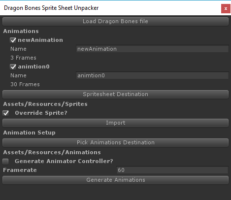 Takes Dragon Bones genererated json file and its generated sprite sheet, slices it and creates the Animation Clips and Animator Controllers
