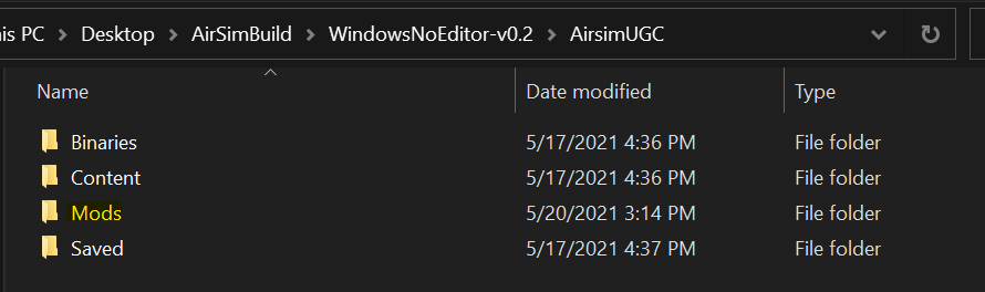 - Go to the folder where you downloaded AirSim-UGC and add a new folder called Mods under the AirSimUGC directory.