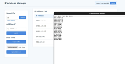 - Регистрация и аутентификация: пользователь может создать учётную запись и войти в систему. Без входа доступ к управлению IP-адресами невозможен.