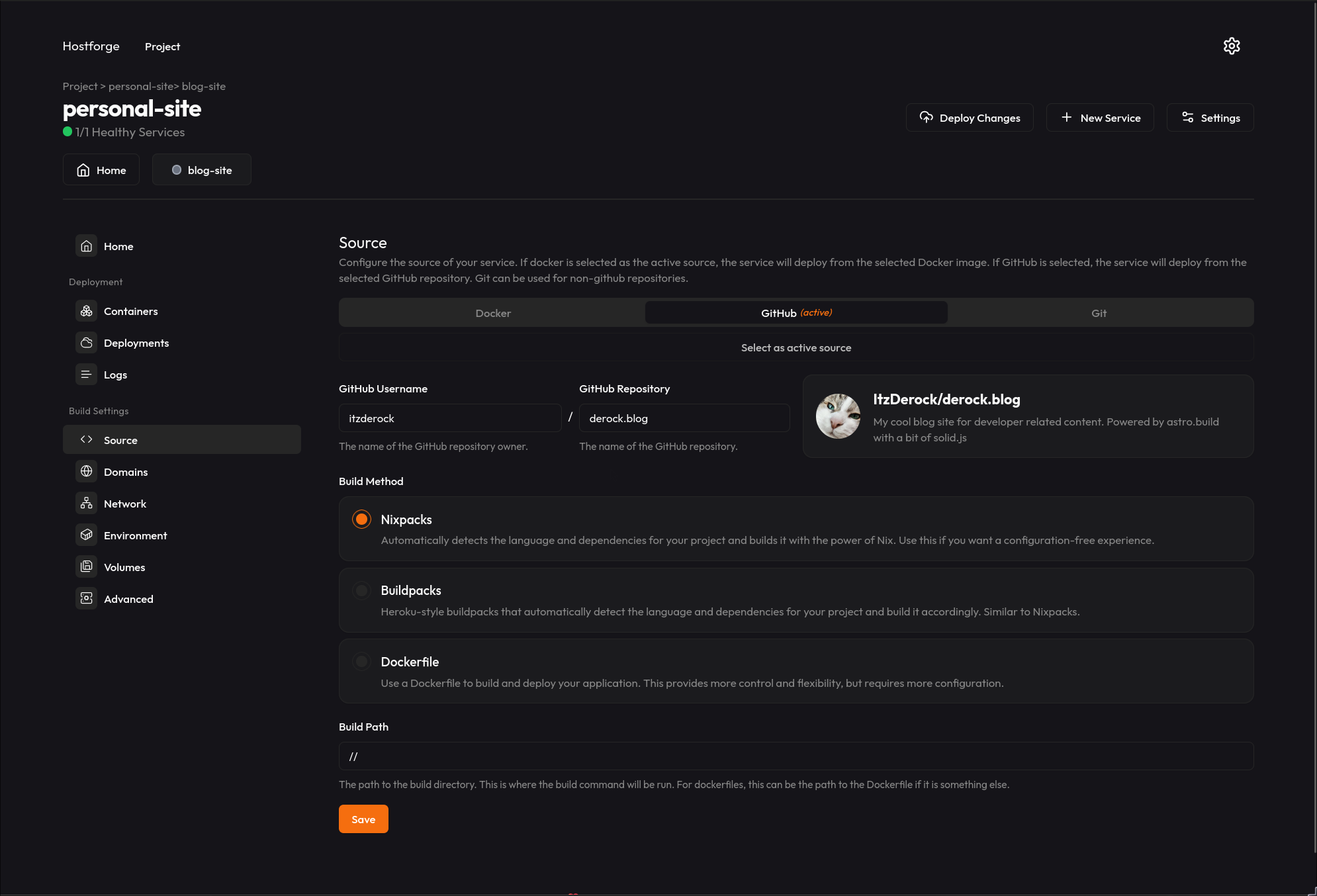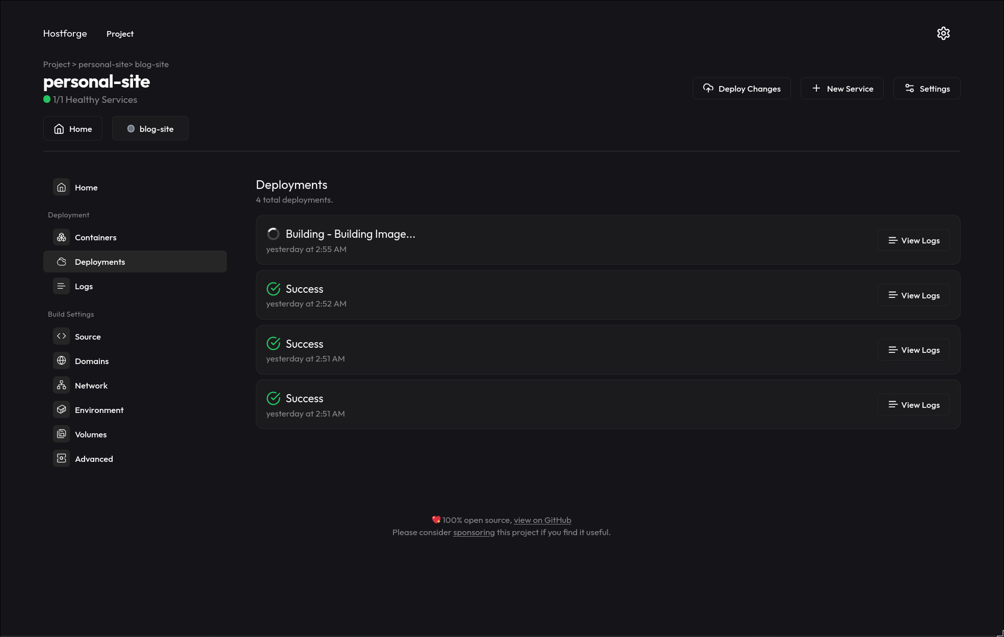 - Simple - With the power of Nixpacks, you don't even need to write a Dockerfile. Just point Hostforge to your git repository and it will build your image and deploy it for you.