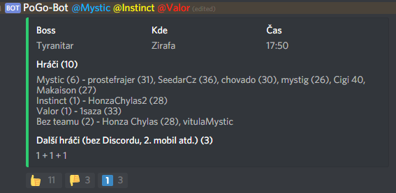 - Set raid boss, location and scheduled time. React with 👍/🚷/🤝 that you will attend and raid poll message will refresh itself
