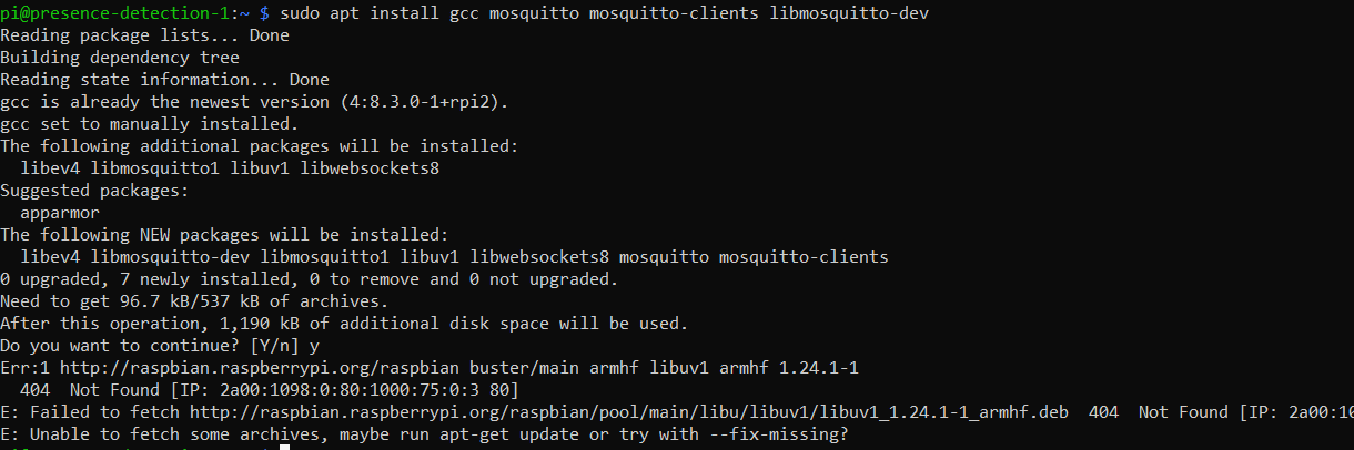I've just seen your video on publishing mqtt messages and faced a problem here. Maybe you or anyone else can help me with that. I've tried to install all the packages, but unsuccessfully: