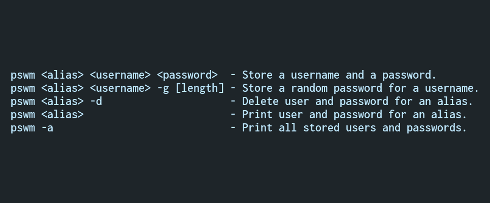pswm <alias> <user> <password> - Store a username and a password.