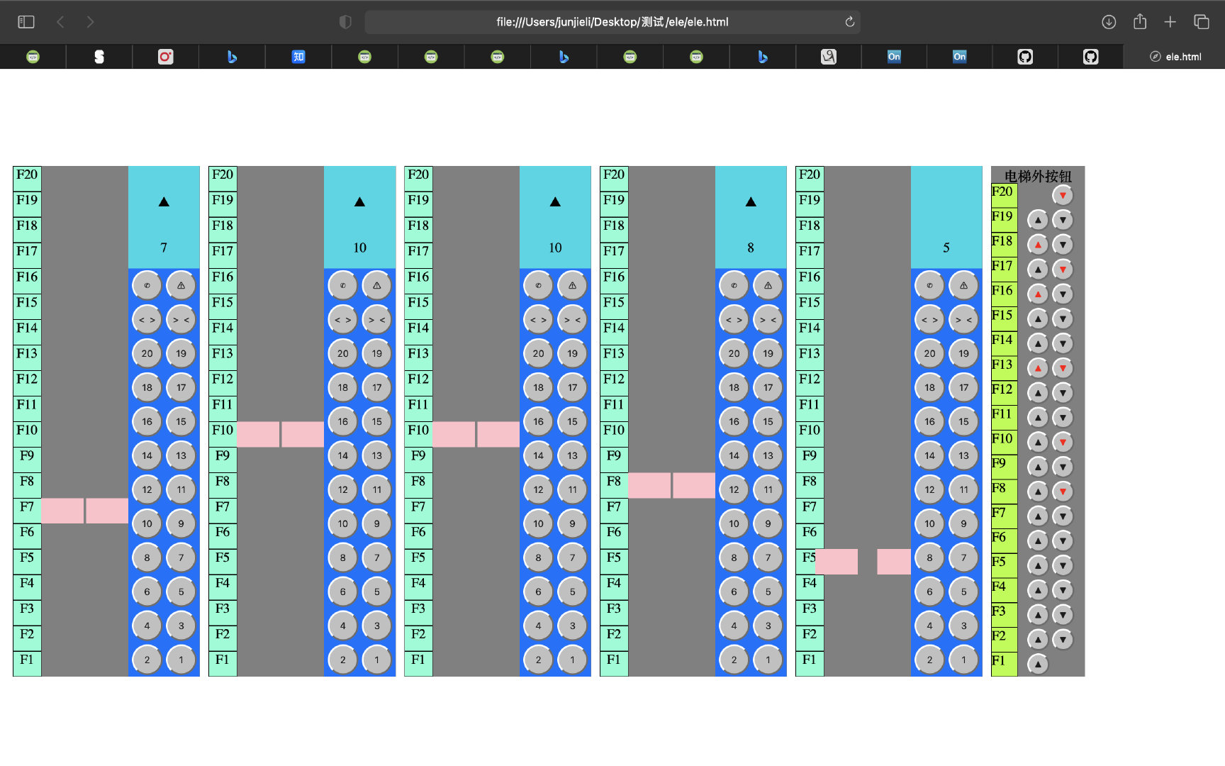 本项目实现了可以设置任意电梯数目,即5部或更多部,只需要修改程序中变量$elevatorNum$的值即可。同时本项目也可以通过同样的方法修改楼层数,但限于$Html$中布局问题,不建议对楼层数作修改。