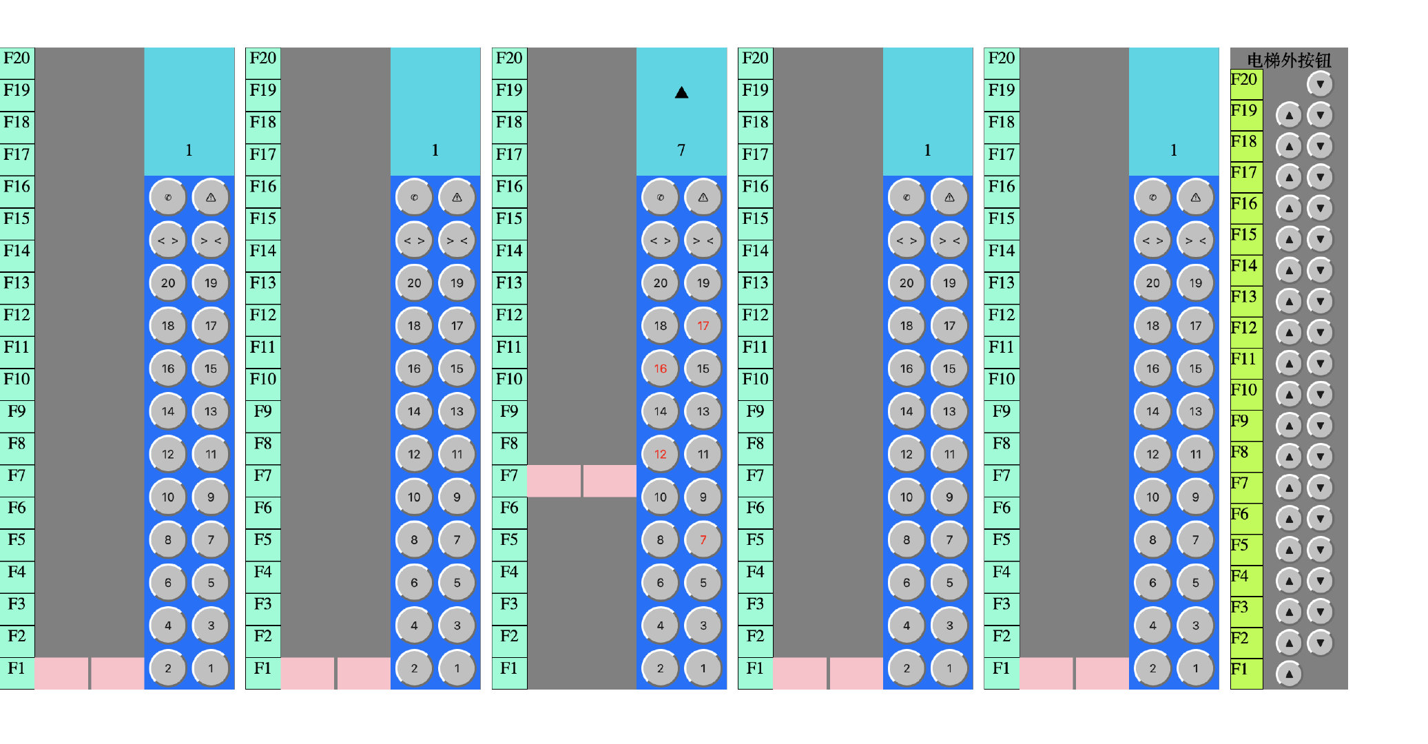 5部电梯门口按钮是相互连接的,用户只需点击在每层楼的一个上行、下行按钮就可以对多部电梯发出使用请求,由其中一台电梯进行服务(调度算法),同时每台电梯在初始模式下处于第一层,在没有请求的情况下在原地保持静止。