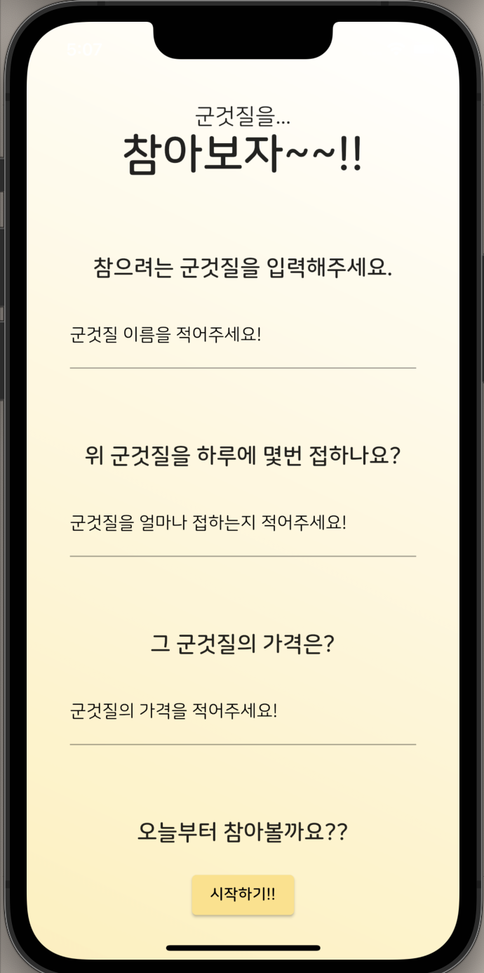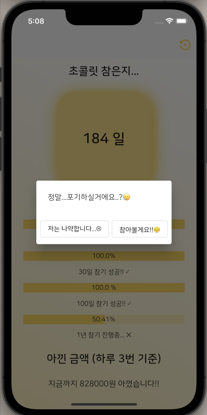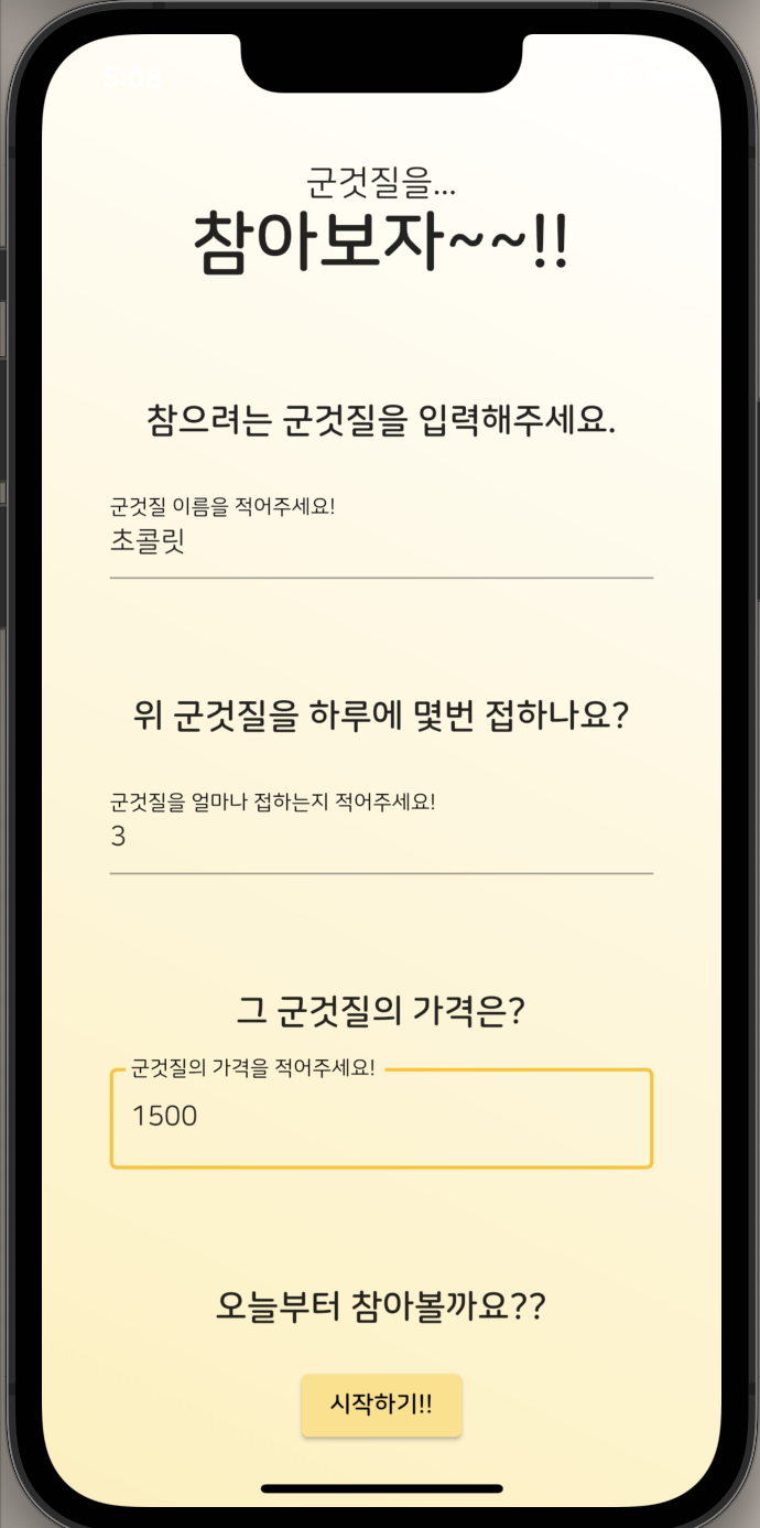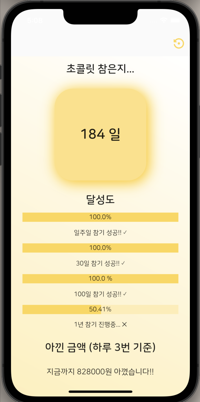 - 이에 대해서 얼마나 참았는지 날짜 계산 및 4개의 목표 달성률을 확인, 또한 군것질을 참음으로써 얼마나 돈을 아꼈는지 확인할 수 있도록 함