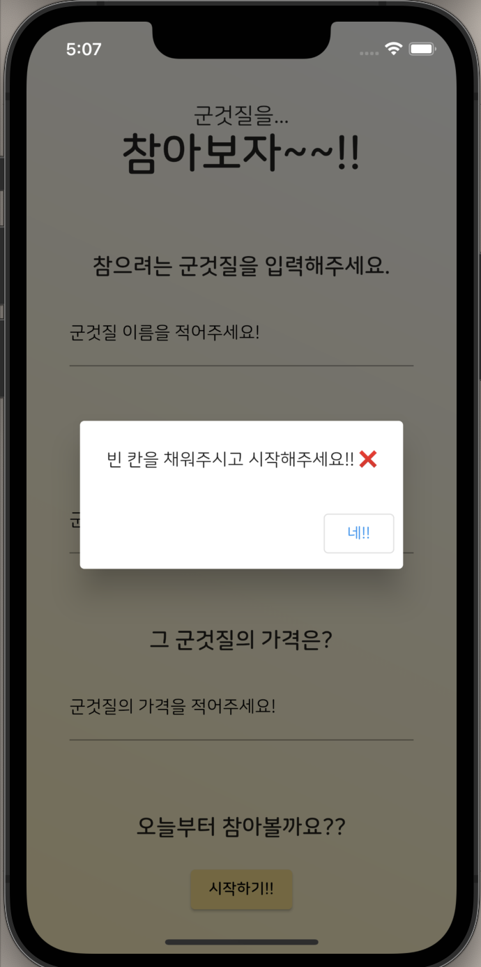- 군것질 이름, 군것질 접하는 횟수, 군것질 가격 입력 TextInputForm (String 타입)