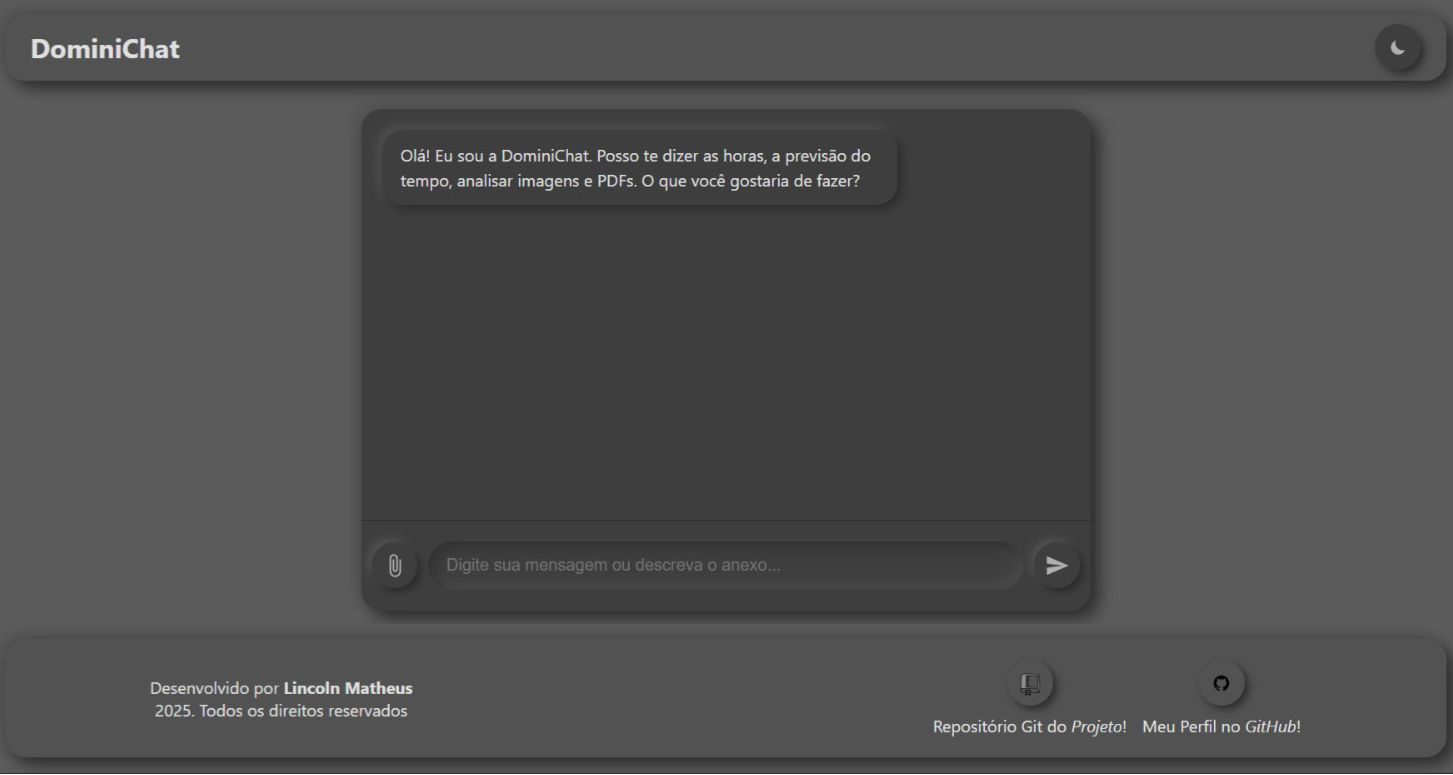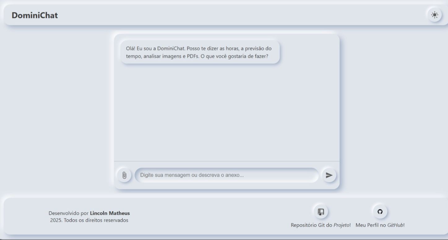 DominiChat é um assistente de IA conversacional construído com Python, Flask e a API do Google Gemini. Este projeto demonstra a integração de um grande modelo de linguagem (LLM) com ferramentas externas em tempo real, permitindo que o chatbot acesse informações como data, hora e previsão do tempo, além de analisar arquivos como imagens e PDFs enviados pelo usuário.